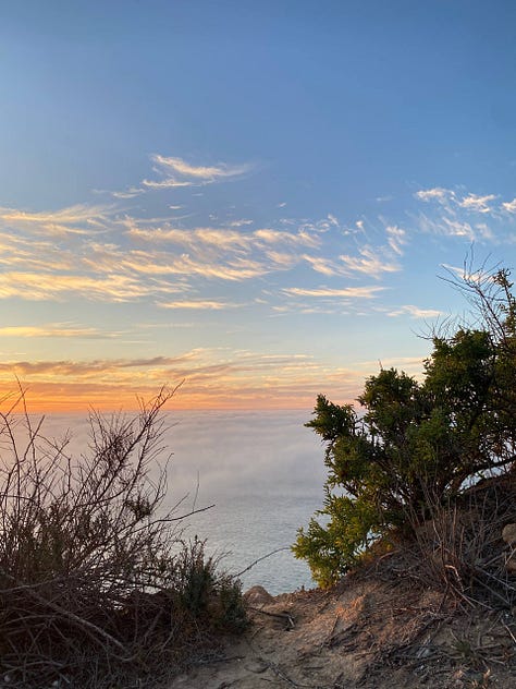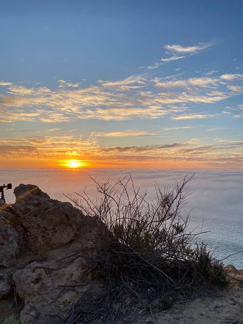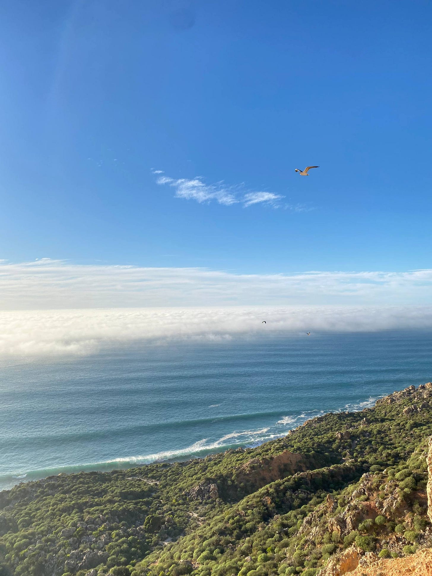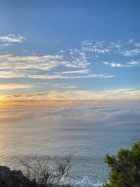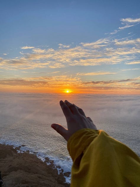 تكاثف الضباب ونزل على سطح البحر المحيط حتى بدى غيوماً ضخمة، كنت في مكان أعلى حيث السحاب مبسوط على مدّ بصري في الأفق البعيد. ظهرت الشمس من بين الغيوم فأشرقت ثم نزلت مجددا خلف غيوم الضباب الكثيفة ثم منها وقعت في صدر البحر، صارت الغيوم برتقالية وهي تحوي أشعة الشمس النارية فيها.